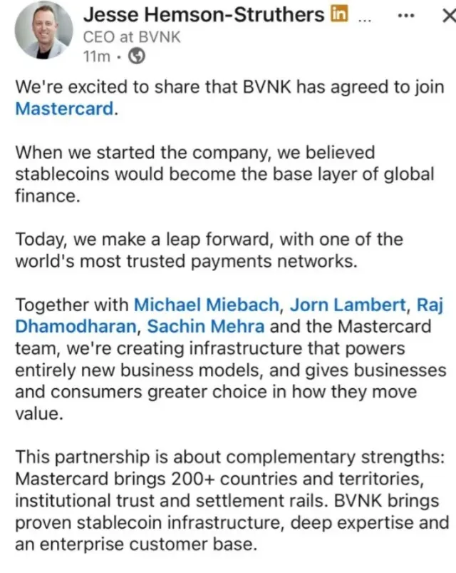 BVNK CEO Jesse Hemson-Struthers called the deal “a major milestone” that will help define the future of money by bridging traditional finance with blockchain innovation.