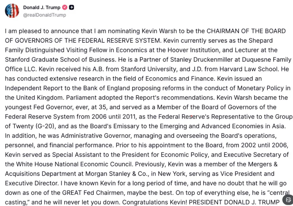 Trump shared the news on his social media platform, Truth Social, praising Warsh for his experience in finance, government, and monetary policy.