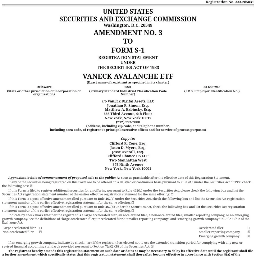 Leading crypto asset manager VanEck has shared updates about its proposed Avalanche (AVAX) ETF with the U.S. Securities and Exchange Commission (SEC).